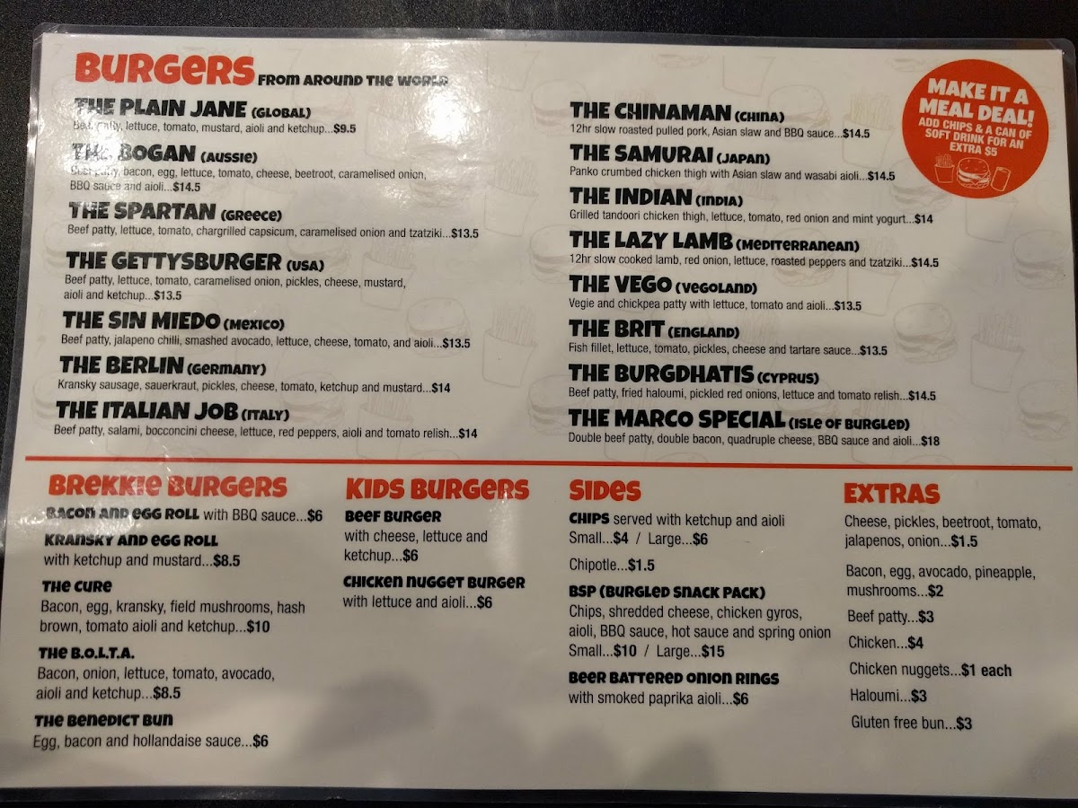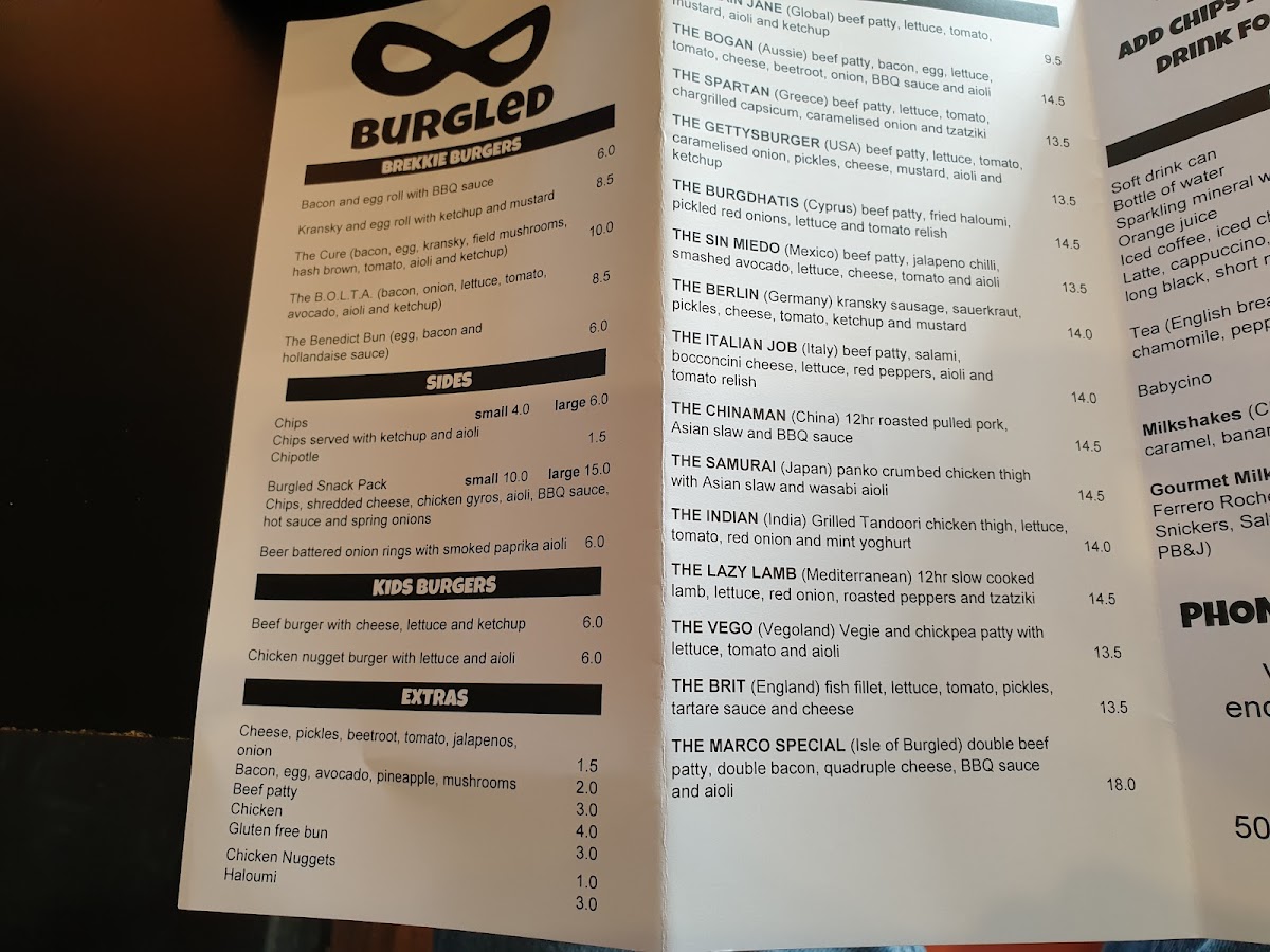 From the moment you skim the menu at Burgled Burgers you get the sense this is a place that embraces variety and bold flavours, with standout options like Gatty’s Burger, The Bogan, Lil Marco Cheese Burger and the Marco Special anchoring the burgers section, while mains range from Tacos and Prawn Linguine to a hearty Steak Sandwich, Garlic Prawns and a rich Creamy Carbonara. Parmas put a local twist on pub classics with Schnitzel, Original Parma, Aussie Pepperoni and Hawaiian, and sauces such as Plain Gravy, Mushroom Onion Gravy and Garlic Butter Sauce let you customise your meal. Sides like Fries, Wedges, Onion Rings, Loaded Fries and Cheese Garlic Bread complement the mains, while desserts including Donuts and Churros (with Nutella Dip) provide a sweet finish. There’s even a dedicated kids section featuring the Kids Beef Burger, Kids Fish & Chips and Kids Nugget & Chips, making the menu approachable for all tastes.